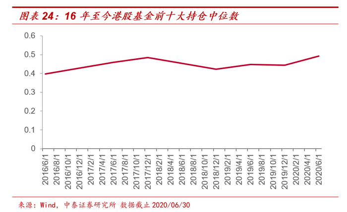 基金的持仓集中度可以反映出该基金管理人主动管理程度与对选股的把握性。如果持股集中,可以侧面看出基金的主动化程度高,基金管理人对选股的自信水平较高。我们测算下来发现,港股基金普遍前十大占比的比例较高。从历史至今的半年报公开数据看到,港股基金的前十大持仓平均仓位在42.6%。