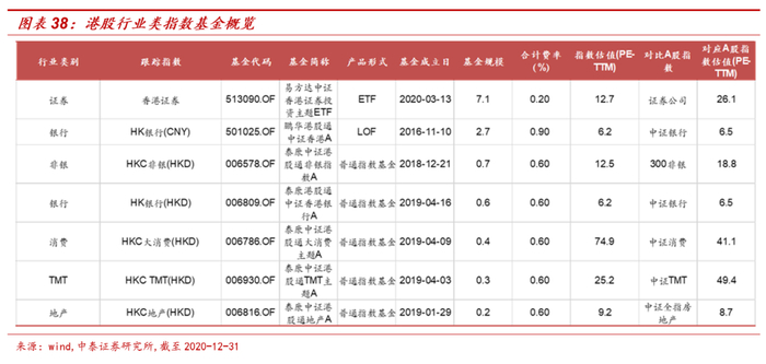 当前港股行业基金布局较少,只有非银、证券、银行、地产、消费和TMT总计7只基金,合计规模12.1亿;其中规模较大的是易方达中证香港证券投资主题ETF和鹏华港股通中证香港。