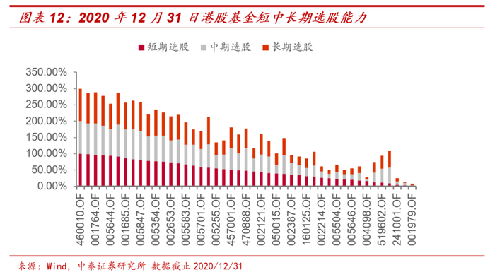 截止2020年12月31日,短、中长期选股能力均值同类前列的基金有前海开源沪港深蓝筹(001837.OF)、工银瑞信香港中小盘人民币(002379.OF)与华泰柏瑞亚洲企业(460010.OF)。以下展示最新一期,部分港股基金短中长期的选股能力同类排序。