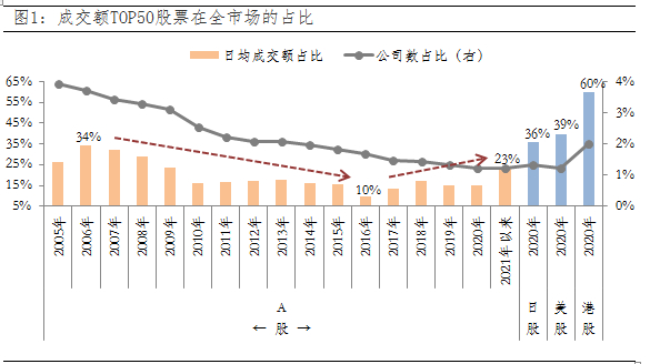 所谓“抱团”,其实就是指资金抱团取暖,扎堆在某一类股票。今年以来,A股1%的公司贡献了23%的成交额(数据来源:wind,截至2021-01-14),以“大消费”为主,可谓是“抱团”到极致。但事实上,从长期看,在机构化、龙头化的背景下,“抱团”或是未来大趋势,而且和日股、美股、港股相比,成交额前50公司的成交额占比仍有较大提升空间,这也就是说,未来“团团”还可以抱得更紧,只是说抱什么的问题。那么,就本轮“抱团”而言,从哪里来?到哪里去?
