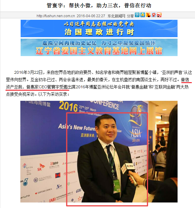 普信的董事长是管环宇(有时也写作“管寰宇”),其曾在2019年8月召开的全球吉商大会上,出任吉商联合会常务副主席兼金融委员会主席。吉林省政府高层也出席了此次会议。正是类似的正面曝光。