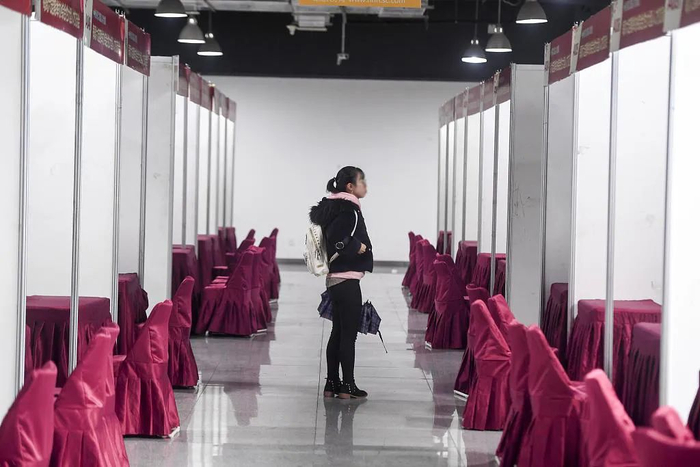 2019年妇女节,湖南长沙一女性专场招聘会现场,女性求职者在屈指可数的几家招聘企业面试