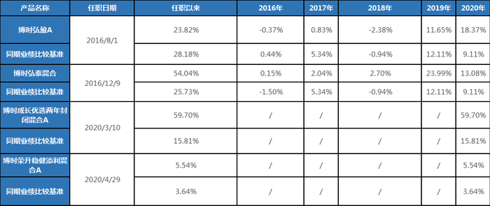 博时裕隆灵活配置混合自2015年8月24日上任,2014年至2020年度净值增长率及业绩比较基准增长率分别为:29.90%/47.18%、50.43%/7.91%、2.91%/-7.71%、2.00%/15.93%、-8.21%/-17.58%、50.55%/27.99%、53.55%/21.29%,任职回报与同期业绩比较基准为175.29%/42.82%。数据来源:银河证券、基金定期报告、wind,数据截至2020.12.31。