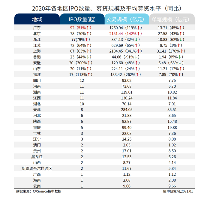 2020年,从IPO数量来看,广东、北京、浙江位居前三位,广东地区以92家位居首位;从交易规模来看,北京地区以2151.44亿元位居榜首,上海地区紧随其后,广东地区位居第三;从单笔交易规模来看,上海地区表现突出。(见图14、表6)