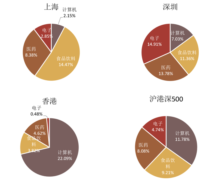 其实A股与港股有非常好的互补性,沪港深500指数就将这种“互补性”体现的淋漓尽致。从前20大权重股列表中,我们发现沪港深500指数选取在港交所上市的计算机行业龙头、在上交所上市的食品饮料龙头,还有在深交所上市的家电龙头。相比较沪深300指数的行业结构,沪深港500指数的行业结构更为均衡。具体数据方面,以计算机、食品饮料、医药和电子为例,在沪,深,港的占比分别为2.14%、14.47%、8.38%、2.85%,7.03%、11.36%、13.78%、14.91%,22.09%、3.82%、4.62%、0.48%,在指数总体中为:11.78%、9.21%、8.08%、4.74%。新经济行业的配置上,沪港深500更显均衡,优势互补 。