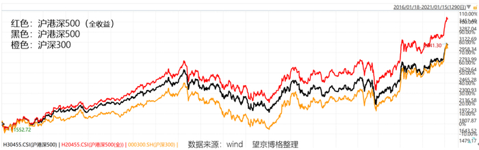 根据wind数据,截止2021年1月15日,在过去五年沪港深500指数累计收益为76.85%,沪深300指数累计收益为75.01%,从指数的走势图中看出,沪港深500涵盖两地三市龙头公司使其天生具有低波动属性,所以在过去五年沪港深500的波动性低于沪深300。同时,由于同样上市公司H股相比A股价格更低,使得沪港深500指数的分红率更高,沪港深500全收益(代码H20455.CSI)最近五年累计收益更是高达102.08%。PS,同一个指数的全收益指数(例如沪港深500全收益)相比其价格指数(例如沪港深500),前者包含成分股分红的收益,而后者不包含成分股分红收益。