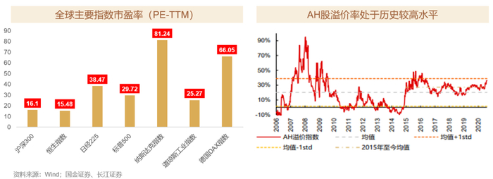 在2019-2020两年A股优质公司持续上涨之后,港股相对A股的估值吸引力越来越大,目前AH股溢价指数处于140点左右位置,意味着同样一揽子公司的A股相比H股贵约40%。通过全球主要指数市盈率(PE-TTM)估值水平的比较,港股的相对的低估值已经成为全球投资者的共识,2021年在经济的修复和低基数效应下,中资非金融上市公司大概率将恢复到较高的盈利增速。