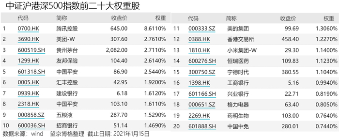 此外,估计投资者也注意到沪深300指数最大成分股贵州茅台,在沪港深中仅为第三大权重股,沪港深500最大的权重股为腾讯控股权重为8.6110%,第二大权重股为美团-W权重为2.7610%。在沪港深500前二十大权重股中,H股有10只合计权重23.52%,A股有10只合计权重14.15%。