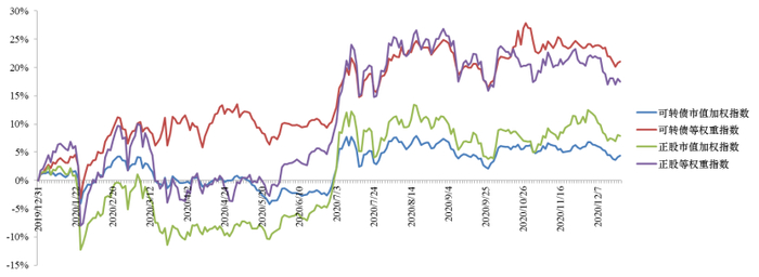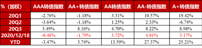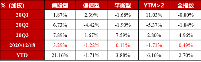 ➤ 4季度偏股型转债指数上涨3.29%,超额收益十分显著,在业绩确定性、行业景气度的加持下,市场愈发不排除高价、低溢价率的品种。反而下半年的几轮信用事件对偏债、低价型品种造成明显冲击,影响范围从少数个券扩散至整体弱资质个券估值,判断在违约预期提升的背景下,债底价值中长期面临重估,2021年需警惕信用分层对转债市场的传导,低价、偏债型并不是低风险偏好的避风港。