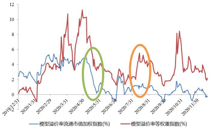 ➤ 加权口径的模型溢价率全年大致可划出四个中枢,等权重口径指标特征类似但波动更大(主要受爆炒小票行情扰动)。