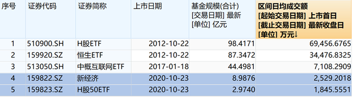 两只ETF已经于2020年10月23日上市,但上市以来的日均成交额仅有2000万元左右,和上文提到的恒生ETF、H股ETF的成交活跃度相比仍有不小差距。