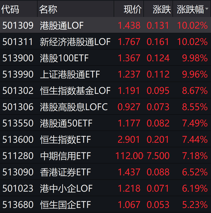 与此同时,港股相关的场内基金也集体放量大涨,港股通LOF、港股100ETF、互联网QD、港股精选、恒生H股等涨停,还有一大批场内基金涨幅超5%,市场上有不少声音直呼:港股的牛市来了!