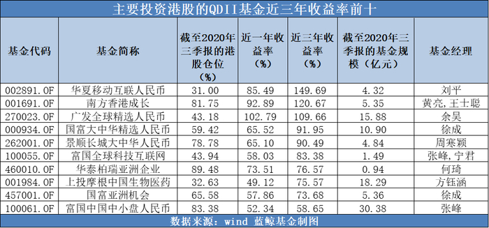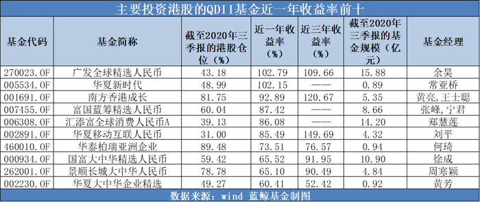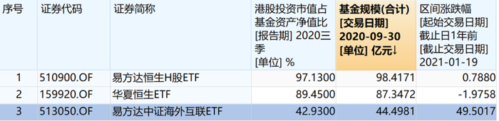据wind数据统计,全市场共有300余只QDII基金(按不同份额分开计算),其中,截至2020年三季报时仅有60余只投资港股的仓位在30%以上,且规模较大的头部产品主要以ETF为主,例如易方达的H股ETF、华夏的恒生ETF、易方达的中概互联ETF等。