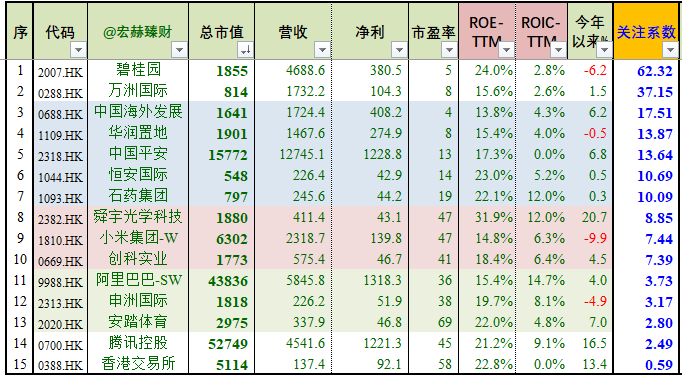 在上述51只成分股中,取值ROE-TTM均值>【12%】公司共计15家(删除关注系数异常值),然后按照宏赫关注系数降序排列如下。