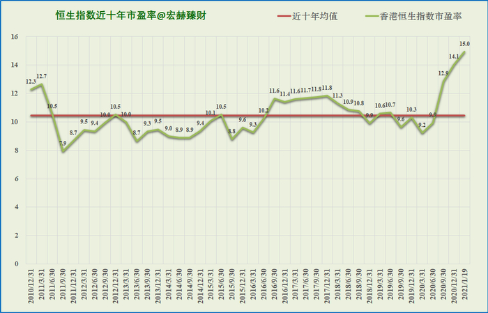 市盈率:恒生指数近十年季度市盈率均值10.4倍,最大值为当前时点的15.0倍;最小值为2011年三季度的7.9倍。当前值15.8倍,处于近十年区间的百分位:【100%】