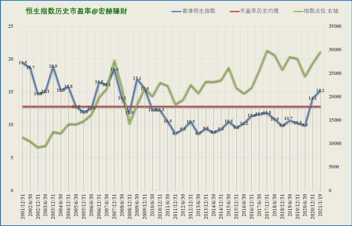 市盈率:恒生指数自2001/12/31日统计以来历史季度市盈率均值12.8倍,最大值为最2001年末19.5倍;最小值为2011年末的8.7倍。当前值15.0倍,处于历史区间的百分位:【61%】