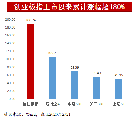 截止2020年12月21日,创业板指数累计涨幅188.24%,大幅超越同期市场主要指数表现,体现较好的成长属性。