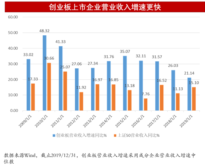 通过比较近些年创业板上市企业与主板上市企业的业绩表现,我们可以发现:创业板业绩增长速度相对更高,成长性更强。自2009年创业板设立以来,创业板营业收入增速(同比)均超越上证50。