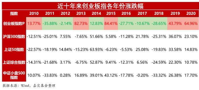 回顾创业板股票过往各年份涨跌幅来看,整体上涨幅度较大,跌幅相对较小,2013、2015年涨幅均超过80%,2019年涨幅43.79%后,2020年上涨64.96%,连续两年位居全球主要指数涨幅之首。