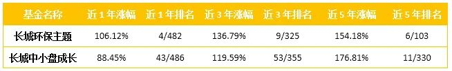 数据来源:基金定期报告,银河证券,截至2020.12.31,长城环保主题排名为灵活配置型基金(股票上下限0-95%+基准股票比例30%-60%)(A类)同类排名;长城中小盘成长排名为偏股型基金(股票上下限60%-95%)(A类)同类排名。长城环保主题、长城中小盘成长近一年、近三年、近五年同期业绩比较基准涨幅分别为:27.18%/23.08%、17.15%/15.86%、8.73%/16.23%。基金的过往业绩并不预示其未来表现,基金管理人管理的其他基金的业绩并不构成基金业绩表现的保证。