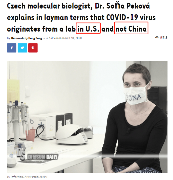 2020年3月底,捷克分子生物学家,索尼娅·佩科瓦博士在公开采访中表示: