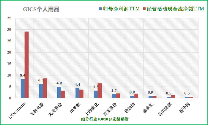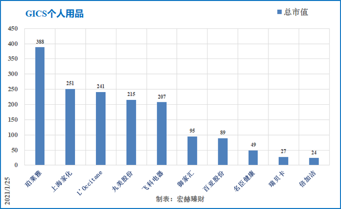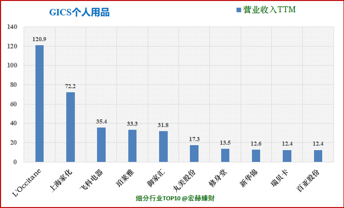 瑞贝卡在GICS“个人用品”子行业中总市值排名9/17。