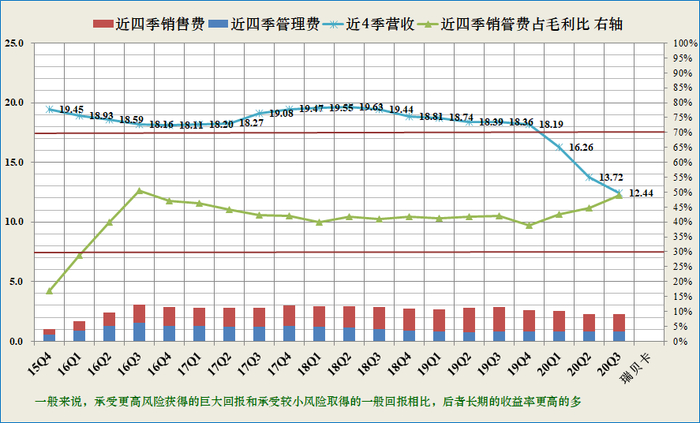 投资者可关注近四季销售和管理费用与毛利润之比持续小于30%的公司(绿线低于下红线为优异,靠近为优秀),具备较高的竞争优势,若30-70%之间为可接受区域(图中红色直线之间),若大于70%需要警惕,说明该公司产生净利润的能力较弱。