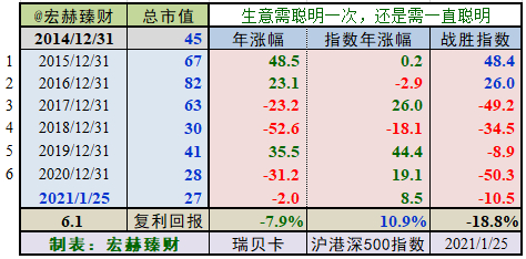 期初至今6.1年的光阴里市值从45亿降低至27亿,实现年均复利回报率-7.9%,同期指数年均增长10.9%。