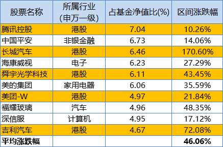中欧互联网先锋四季度末披露的前十大重仓股,合计占基金净值比为58.18%,其中有5只港股公司。十大重仓股平均区间涨跌幅46.06%!(来源:wind,统计区间2020年4季度)