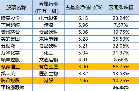 中欧阿尔法前十大重仓股合计占基金净值比为46.34%,前十大股中仅一只股票四季度区间下跌,其他区间收益都为正,平均涨幅高达51.50%(来源wind)。