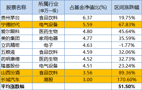 注:以上基金的数据都来源各基金2020年4季报;重仓股行业分类是申万一级行业指数分类,统计区间为2020年4季度,前十大重仓股仅代表个股在该季度的涨幅情况,并不意味着基金持有这只个股整个季度及所获收益。