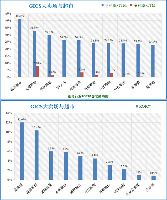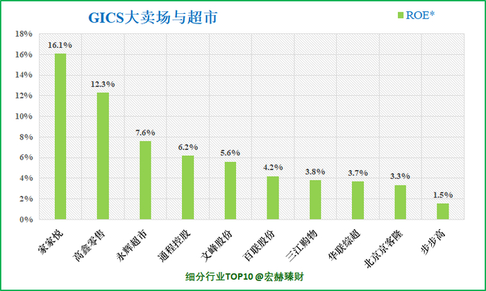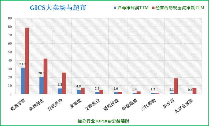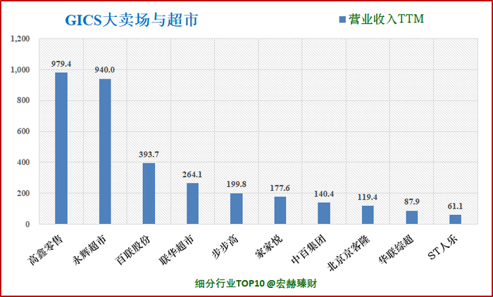 永辉超市在GICS“大卖场与超市”子行业中营业收入排名2/16;净利润排名2/16。