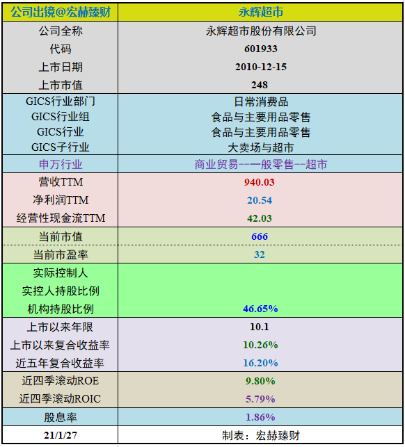 永辉超市在GICS“大卖场与超市”子行业中总市值排名1/16。