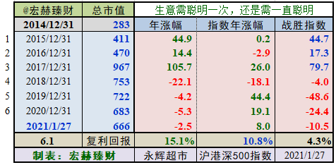 期初至今6.1年的光阴里市值从283亿增长至666亿,实现年均复利回报率15.1%,同期指数年均增长10.8%。