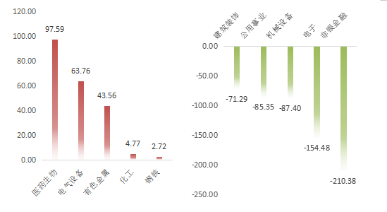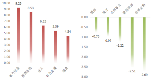 医药生物、电气设备、有色金属、化工、钢铁