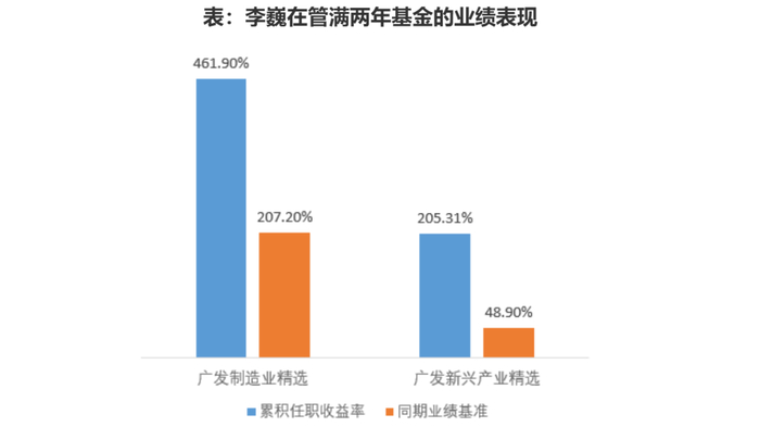 优秀业绩证明了这套打法的有效性。银河证券统计显示,截至1月29日,李巍管理了9年多的广发制造业精选,任职回报461.90%;管理近5年的广发新兴产业精选,任职回报207.20%,两只产品均大幅跑赢业绩比较基准。