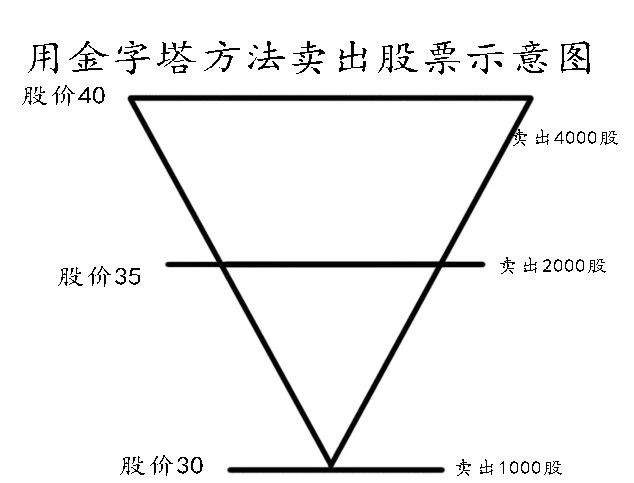 仍如上述投资者购买的股票为例,假定当价格上涨到每股市价30元时,投资者认为价格在上涨一段时间后会出现下跌,因此,就采用例金塔卖出法先出售1000股,当股价升至35元时,出售更多的部分(比如2000股),当股价涨至37元时,则全部售出。