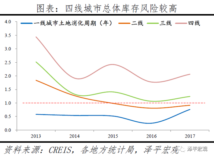 从广义库存看,西部地区、四线城市库存偏高,2017年土地消化周期分别为2.5、2.1年。分地区看,东部、中部、东北地区库存持续改善,西部地区库存改善力度明显不足。2017年,东部、中部、东北地区土地消化周期均在1.15-1.35年之间,而西部地区则高达2.5年。分线城市看,2017年一线、二线、三线、四线城市土地消化周期分别为0.8、0.9、1.2、2.1。尽管一线城市受2016年930开始的调控收紧影响,市场销售持续降温,但土地消化周期基本小于1;四线城市销售乏力,土地供应持续增加,仍有较大库存风险。