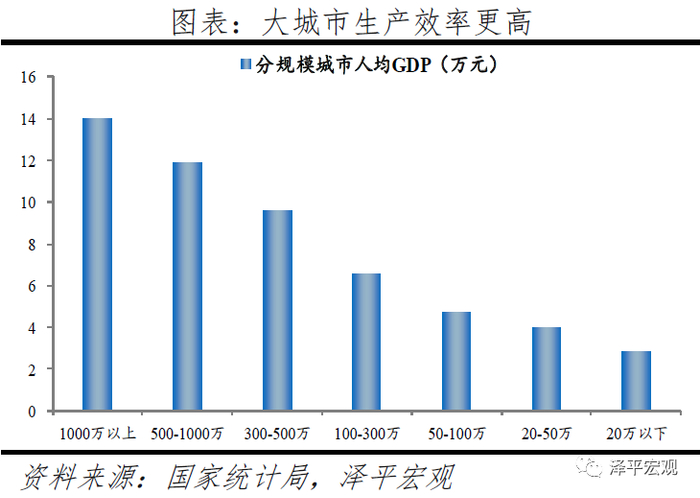 以中心城市为引领的都市圈城市群更具生产效率,更节约土地、能源,是支撑中国经济高质量发展的主要平台,是中国当前以及未来发展的重点。根据基本面排名,2019年发展潜力百强城市中有96个位于19大城市群,其中处于24个千万级大都市圈的有54个。2018年11月,国务院《关于建立更加有效的区域协调发展新机制的意见》要求,建立以中心城市引领城市群发展、城市群带动区域发展新模式,推动区域板块之间融合互动发展。以住建部城区常住人口为标准,将城市划分为1000万以上、500-1000万、300-500万、100-300万、50-100万、20-50万、20万以下七类。从人均生产效率看,分规模人均创造GDP呈现规模从大到小的递减现象;1000万人以上的城市人均创造14万元的GDP,是100-300万人城市的2.1倍,是20万人以下城市的约5倍。从人均城市建设用地看,大城市明显更节约土地资源,分规模人均创造GDP呈现规模从大到小的递增现象,2017年1000万人以上城市人均建设用地仅74.5平方米,而100-300万、20万以下城市分别为117.3、135.5平方米。