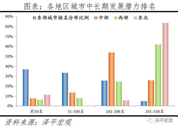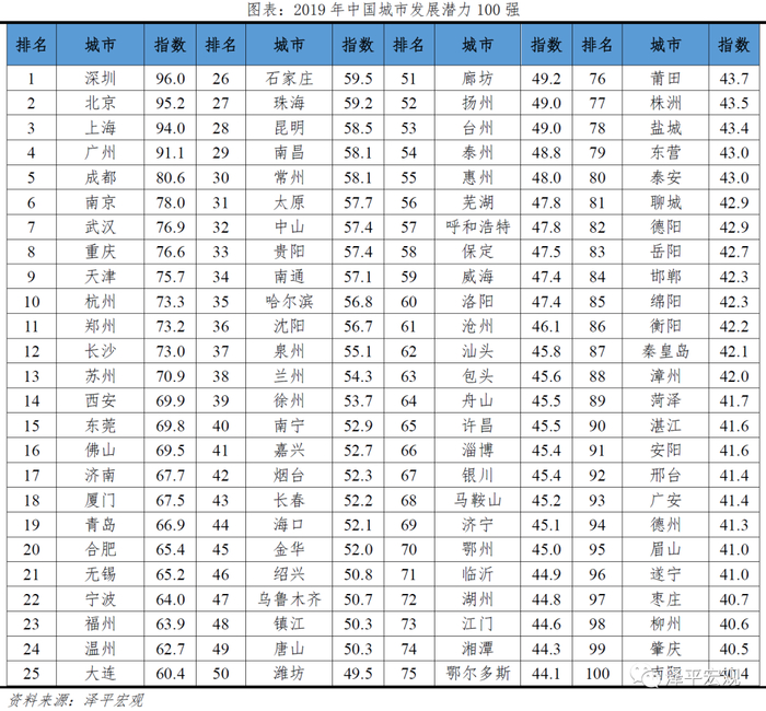 2019年深北上广稳居中长期发展潜力榜单前4名,二线城市中成都、南京、武汉、重庆、天津、杭州位居前十;东部地区有32座城市进入前50名,东北地区有超八成城市位于200名之后。百强城市以全国13%的土地,集聚50%的人口,创造约73%的GDP,占全国商品住宅销量的约62%。深圳占据城市发展潜力榜首,北京、上海、广州紧随其后。二线城市中,成都、南京、武汉、重庆、天津、杭州位列前10名;郑州、长沙、西安、济南、合肥等省会城市,厦门、青岛等计划单列市,苏州、东莞、佛山等发达地级市进入前20名。省会城市除呼和浩特、银川、西宁、拉萨外均排名前50。在前50名城市中,东部地区多达32个,中部、西部、东北地区分别有6、8、4个。除直辖市、省会城市和计划单列市外,前50名其余地级市大多分布在长三角、珠三角地区,其中长三角城市群8个,珠三角城市群4个,海西城市群、山东半岛城市群各2个。分地区看,东部、中部、西部地区排在200名之后的城市占比分别为4.6%、22%、64.1%;东北地区有30座城市位列200名之后,占本区域地级单位个数的83.3%,发展潜力总体靠后。需注意,各指标经标准化处理后合成的发展潜力指数仅具备序数意义。