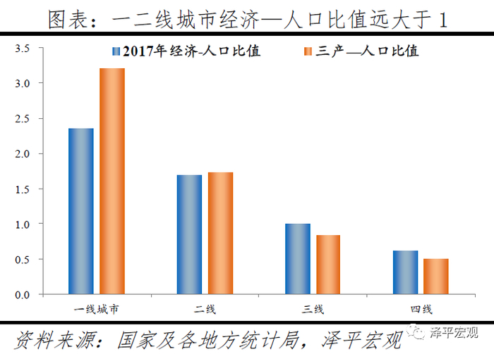 一二线城市以25.5%的人口创造了46.5%的GDP,人口集聚潜力很大。当前一线城市以5.2%的人口创造了全国12.3%的GDP,二线城市以20.3%的人口创造了34.1%的GDP,三线城市的人口份额与经济份额基本持平、分别为33.9%、34.0%,四线城市的人口份额明显低于经济份额、分别为39.7%、24.5%(因统计问题,地区GDP合计与全国存在差异)。从经济—人口比值来看,2017年一、二、三、四线城市分别为2.4、1.7、1.0、0.6;从剔除工业因素的第三产业-人口比值看,2017年一、二、三、四线城市分别为3.2、1.7、0.8、0.5。从经济增速看,2015-2017年,一线、二线、三线、四线城市年均经济增速分别为7.5%、7.9%、7.8%、6.8%,四线经济规模基数小、但增速仍然乏力。从区域看,近几年经济增速比较低的地区是辽宁、山西等数据挤水分地区及东北、西部等偏远地区,经济增速多在6%以下;而中部不少地区经济增速在8-10%之间,西南部分地区更是在10%以上。总体上看,未来人口将继续向大都市圈和区域中心城市集聚,三四线城市全域人口未来将继续大幅流出。