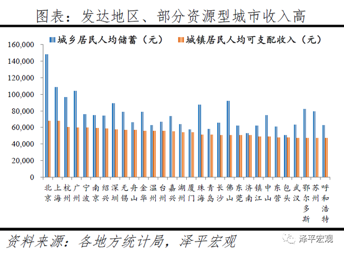 一线城市人均储蓄存款、可支配收入分别高达11.5、6.6万元,远高于其他城市。绝对购买能力不仅是可支配收入,还应包括人均储蓄存款,尽管当前“存款搬家”现象明显,但仍能反映相关情况。从城乡居民人均储蓄存款看,2017年一线、二线城市分别为11.5、6.6万元,三线、四线城市分别为4.1、3.2万元。从城镇居民可支配收入看,2017年一线、二线城市分别为6.4、4.5万元,三线、四线城市分别为3.6、3.1万元。此外,包头、鄂尔多斯、呼和浩特等部分资源型城市人均储蓄存款及可支配收入也较高。