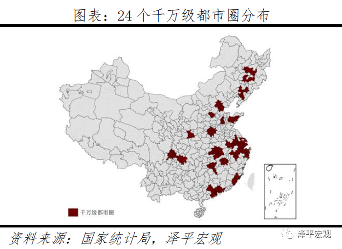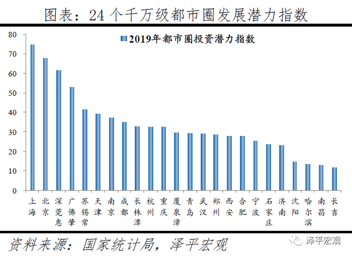 在都市圈层面, 24个1000万人以上的大都市圈以6.7%的土地集聚33%的人口创造约54%的GDP,其中上海、北京、深莞惠、广佛肇等都市圈发展潜力明显居前。鉴于当前多数城市群发育不成熟,且部分核心城市生产要素明显向周边溢出,中央把以大城市为核心的都市圈作为城市群建设的突破口和抓手。2019年2月,国家发改委发布《关于培育发展现代化都市圈的指导意见》,这是中国第一份以“都市圈”为主题的中央文件,要求以大城市及周边地区同城化为方向推进基础设施一体化、强化城市间产业分工协作、加快建设统一开放市场、推进公共服务共建共享等,包括以轨道交通等为基础打造1小时通勤圈。根据有关城市群规划及相关地方规划,当前中国有上海、北京、广佛肇、杭州、深莞惠等10个2000万人以上的大都市圈,有重庆、青岛、厦泉漳等14个1000万-2000万人大都市圈。24个千万级大都市圈以全国6.7%的土地集聚约33%的常住人口,创造约54%的GDP。从发展潜力看,上海、北京、深莞惠、广佛肇都市圈居前,之后则是苏锡常、天津、南京、长株潭、杭州、重庆等都市圈。需要注意的是,部分都市圈范围有重合,比如上海都市圈与杭州都市圈、苏锡常都市圈均有重合。