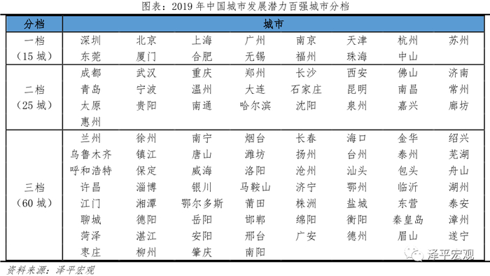 基本面:2019年中国城市发展潜力排名。1)榜单概览:2019年深北上广稳居中长期发展潜力榜单前4名,二线城市中成都、南京、武汉、重庆、天津、杭州位居前十;东部地区有32座城市进入前50名,长三角、珠三角地区表现尤其突出;东北地区有超八成城市位于200名之后。百强城市以全国13%的土地,集聚50%的人口,创造73%的GDP,占全国商品住宅销量的62%。2)人口现状:人口持续向大城市集聚,中西部核心城市崛起。从区域层面看,当前人口回流皖川桂豫等中西部省份与粤浙等东部省份人口再集聚并存,京沪津苏黑吉辽人口增长低迷甚至负增长。从分线城市看,人口持续向一二线大城市流入,三线城市全域流入流出基本平衡,四线城市持续流出。从重点城市看,深圳、广州、杭州常住人口大幅增长,西安、成都、长沙等中西部核心城市日益崛起,北京、上海、天津、苏州、无锡等东部城市人口增长放缓。3)人口潜力:人随产业走,一二线产业基础及潜力突出。一二线城市以25.5%的人口创造了46.5%的GDP,人口集聚潜力很大。在产业创新方面,一二线城市头部效应显著,上市公司占比、发明专利授权量合计分别占约70%、75%,其中京沪深占据绝对高地,杭州、广州、苏州、南京、成都等城市居前。在交通区位上,一二线城市占据交通枢纽地位,高铁始发终到趟数分别高达740、149趟,东部地区受益于自然地理和率先发展战略交通基础条件更优。在公共资源上,一二线城市优质教育、医疗资源密集,城市轨道交通提升城市运行效率。4)购买能力:一二线城市绝对购买能力较高,相对购买能力较低。从绝对水平看,一线城市人均储蓄存款、可支配收入分别高达11.5、6.6万元,远高于其他城市。从相对水平看,一线、二线、三线、四线城市房价收入比分别为20.8、10.6、8.4、6.0年,但一线城市因供给不足,房价并非由中位数收入人群决定,而是由高收入人群决定。5)住房供给:一二线城市住房供给偏紧,二三线土地财政依赖度较高。一二线城市住房供给偏紧、套户比分别为0.97、1.02,东北地区有过剩风险、套户比超过1.1。东部、中部土地财政依赖度较高,分别为57%、52%;二三线城市较高,分别为64%、50%。