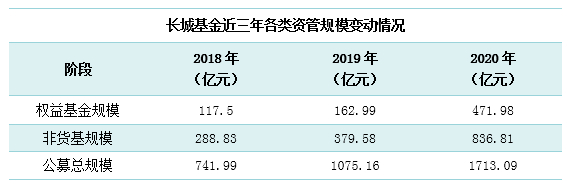 规模也许会迟到,但从不会缺席。在优异业绩的加持下,公司资管规模增长也开启了加速度。长城基金数据显示,截至2020年底,公司非货币资管规模836.81亿元,较2019年底增长120%;权益规模471.98亿元,较上年末增长190%;公募总规模已超过1713亿元,较上年末增长59%。
