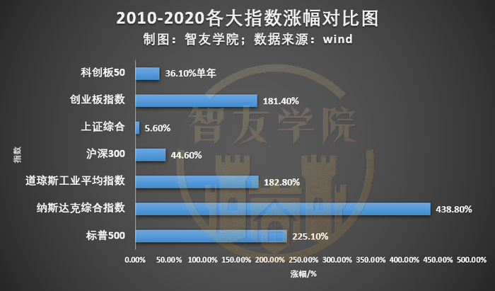 下图对比了美股和A股的各大指数。创业板指十年涨了181.4%,几乎与道琼斯工业平均指数持平,而科创50实现了单年增长36.1%。