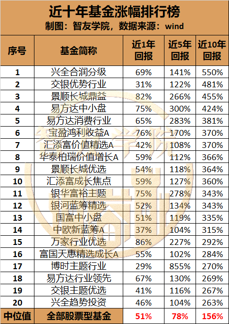 下图是过去十年涨幅前20的基金,有一个数据也值得关注:全部股票型基金的涨幅中位数是156%。