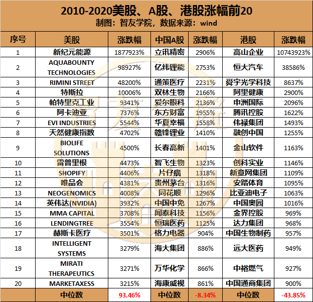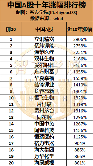 下图是A股过去十年涨幅前20的股票。