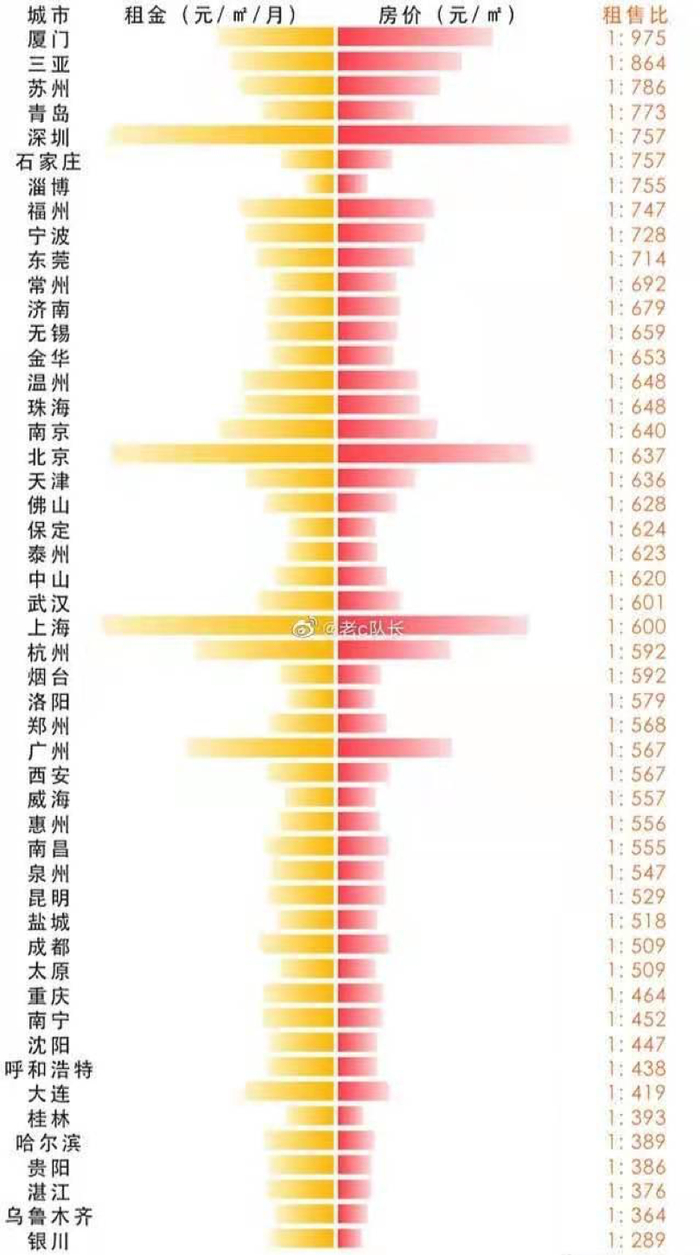 据报告,2020年全国50个重点城市的租售比1:611,远低于国际合理租售比区间水平,其中,仅有银川一个城市租售比为1:289处于合理区间内。50个城市中,厦门售租比最大,为81.3年,也就意味着在房价和租金不变的前提下,在厦门需要81.3年才能通过租金收回买房成本。
