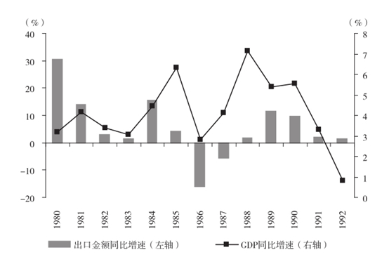 广场协议签署后,日本出口开始出现下滑停滞,1986年和1987年出口同比分别下滑了15.89%和5.60%。